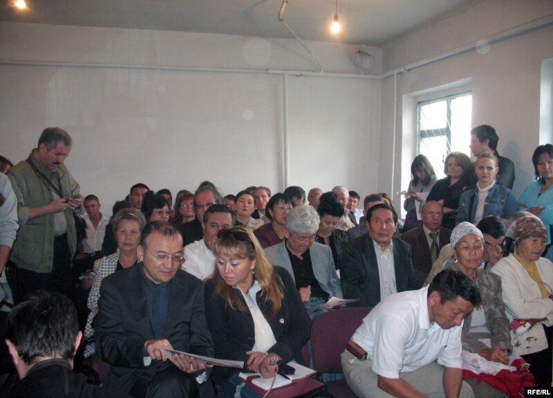 Бақанастағы сотқа қатысып отырған журналистер мен саясаткерлер, қоғам өкілдері.
