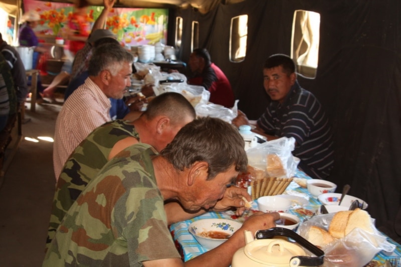 "Бәтуа" компаниясының жұмысшылары түскі астарын ішіп отыр. Шығыс Қазақстан облысы Үржар ауданы, 24 мамыр 2011 жыл.